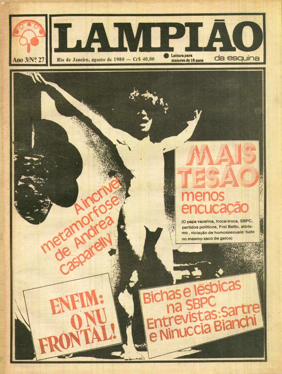 O Lampião da Esquina, foi um jornal mensal que circulou nas bancas de todo o Brasil entre os anos de 1978 e 1981 – período do dito ‘abrandamento’ da ditadura militar. Edições originais do jornal foram exibidas na mostra Os corpos são as obras, gentilmente cedidas pelo grupo Arco Íris. As edições completas do jornal em formato digital, estão disponíveis para download, e em formato PDF pesquisável por palavra-chave, no arquivo do Centro de Documentação Pr. Dr. Luiz Mott do grupo Dignidade.